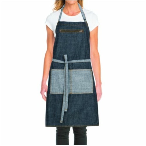 This apron features a tough denim look with the soft feel of cotton. The zippered chest pocket gives a handsome twist on the norm while keeping your items close to hand. Having an adjustable metal neck buckle complimented by reverse fabric ties and pockets are just a few of the features that demand attention. Riveted pocket ends on double front pockets allow for long term, functional use. The Urban Denim Bib Apron is available in indigo blue. We use a lightweight 6oz cotton blend denim that meets all the requirements of comfort and durability. The fabric has a nice, soft feel to it.